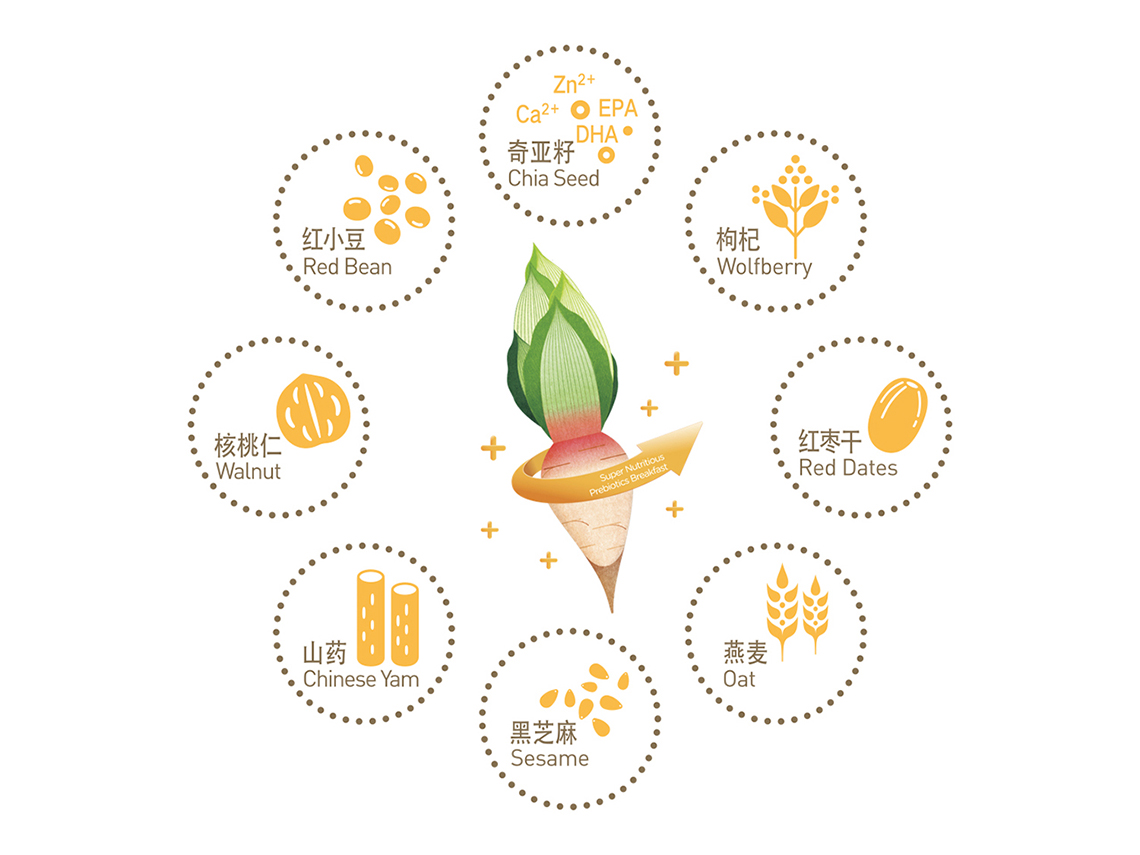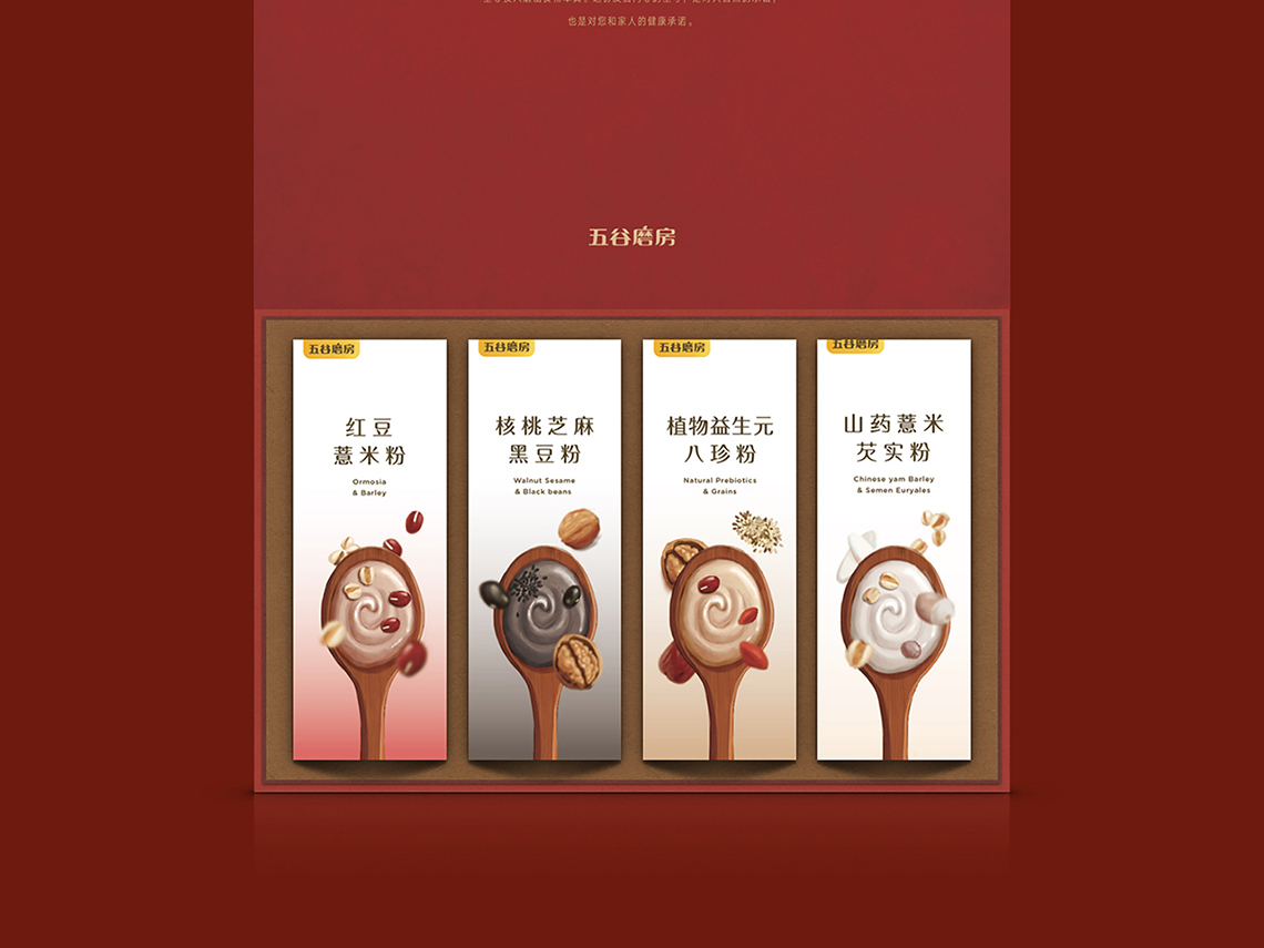 “五谷伴侶”作為搭配食用產(chǎn)品,設(shè)計(jì)思路以展現(xiàn)“原料新鮮健康、口感豐富美味”為主,通過增強(qiáng)整個(gè)系列的食欲感來提升消費(fèi)者購買量。在視覺表現(xiàn)上,形成固定的構(gòu)圖屬式,整體包裝風(fēng)格延續(xù)益元八珍清新自然的風(fēng)格。