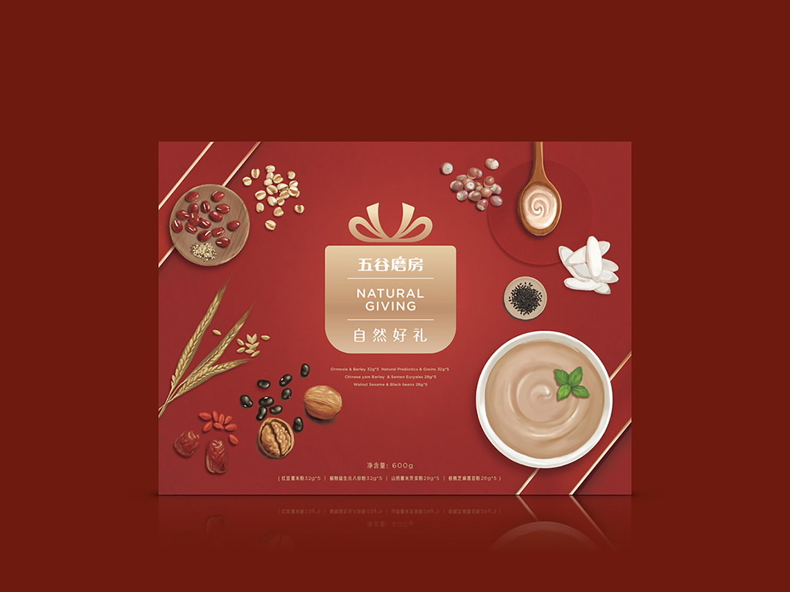 “春節(jié)禮盒裝”以迎合中國傳統(tǒng)春節(jié)氣氛而設(shè)計(jì),整體畫面設(shè)計(jì)也以烘托原材料的健康天然為主,同時(shí)增加禮盒元素的設(shè)計(jì),使其節(jié)日氛圍更為凸顯。