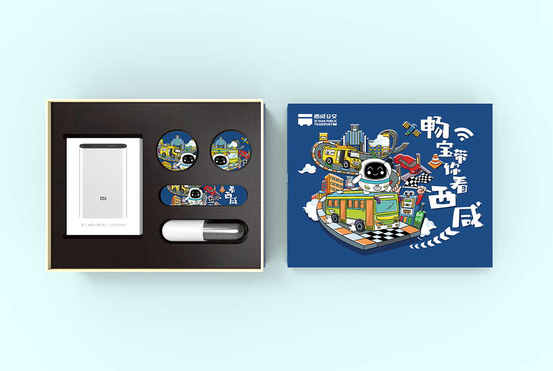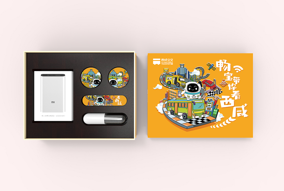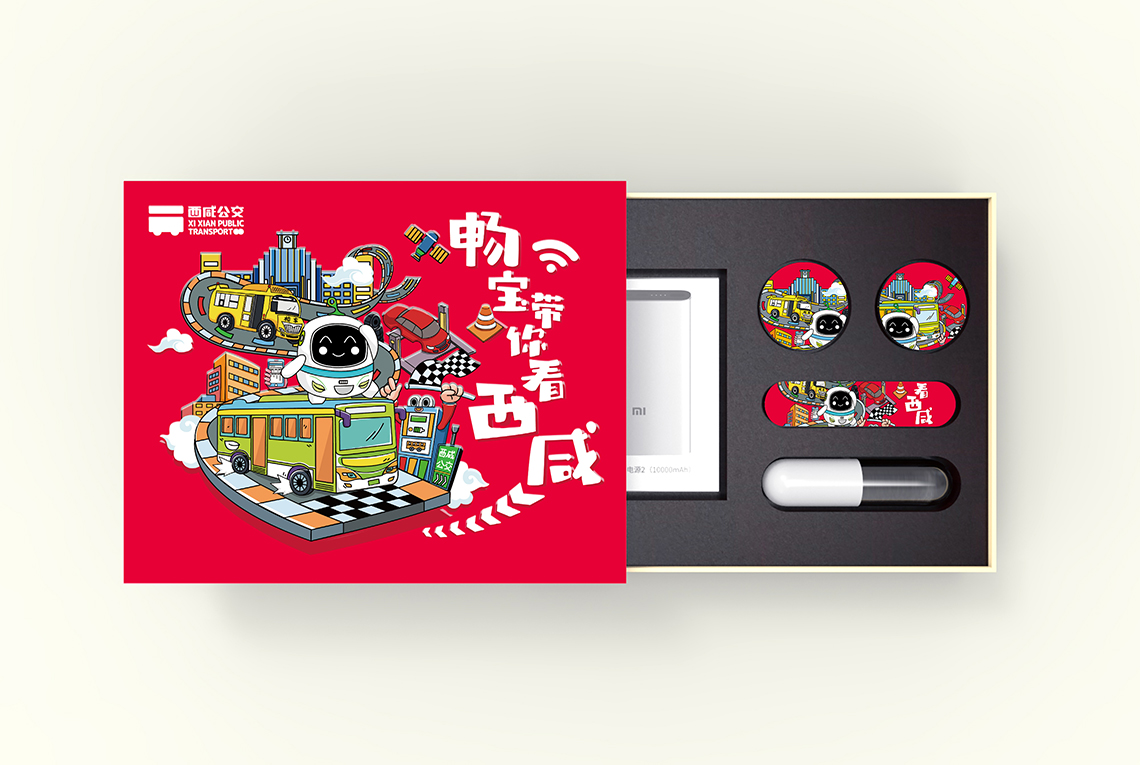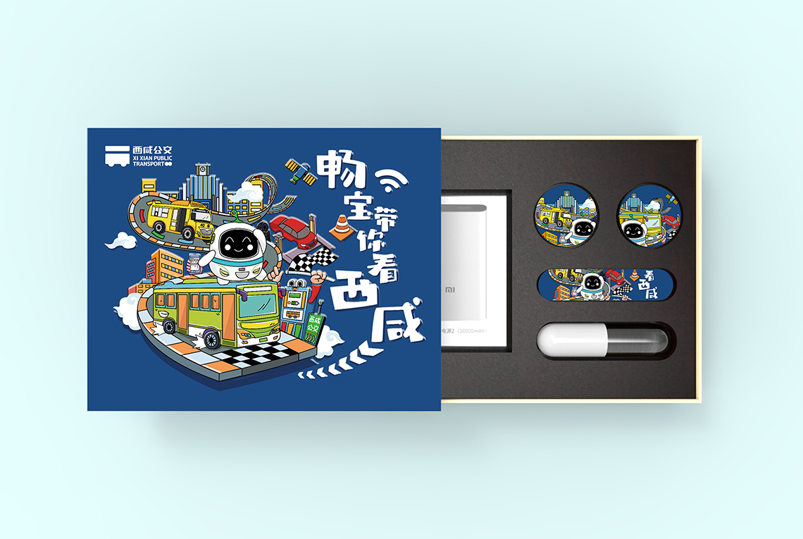根據(jù)西咸公交綠色、智慧、定制、智能的服務(wù)理念和特點(diǎn),我們提出“智享生活”的理念,帶你看最精彩的,玩最好玩的,禮盒畫面中,企業(yè)“IP”暢寶以一位活潑的小導(dǎo)游形象向各位介紹特色的西咸公交。